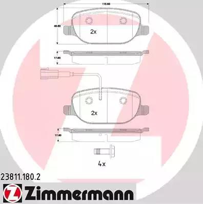 Товар 23811.180.2 Комплект тормозных колодок ZIMMERMANN с оригинальным номером произвоителя 23811.180.2 для автомобиля марки ZIMMERMANN